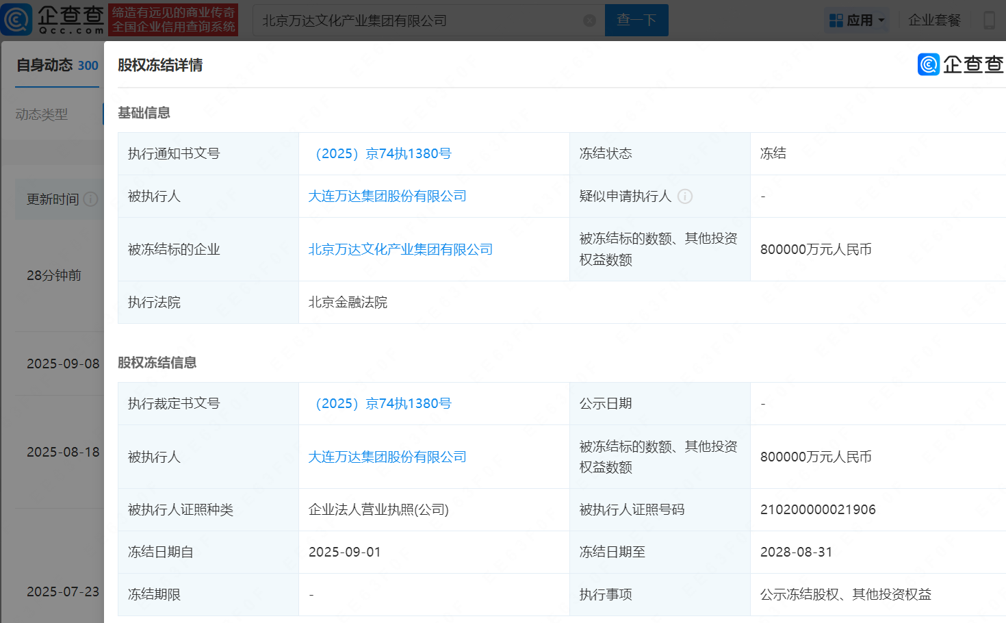 另据企查查APP显示,近日,北京万达文化产业集团有限公司再次新增1条股权冻结信息,被执行人为大连万达集团股份有限公司,冻结股权数额为80亿元,冻结期限为2025年9月1日至2028年8月31日,执行法院为北京金融法院。